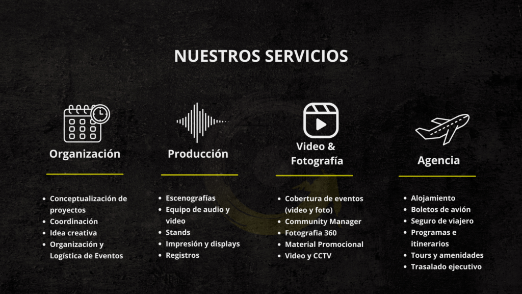 Somos una empresa especializada en la organización planeación y producción de eventos. Con más de 22 años de experiencia tenemos una amplia gama de servicios integrales para cubrir los eventos mas importantes de nuestros clientes